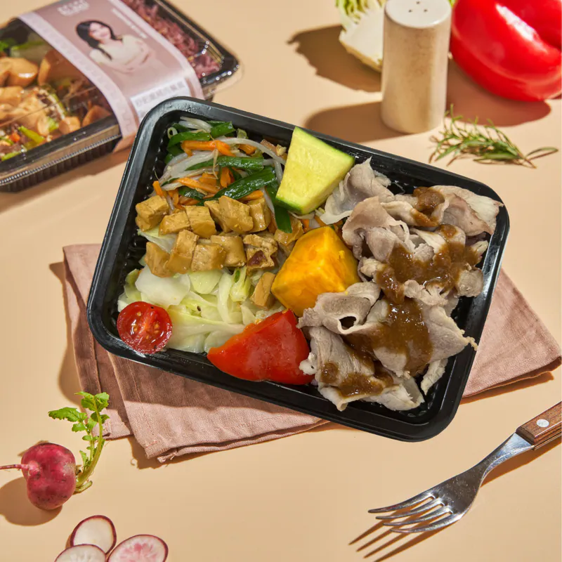 - 蒜泥白肉嫩豬便當:選用低溫舒肥技術處理豬肉使其嫩滑,搭配蒜泥醬汁不重鹹重油。內含五穀紫米飯、蔬菜、地瓜、水煮蛋與兩款配菜,一整盒就是完整的「減脂餐怎麼吃」示範。